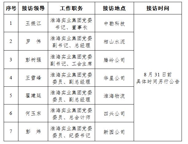 根據(jù)工作安排,現(xiàn)就淮海實(shí)業(yè)集團(tuán)領(lǐng)導(dǎo)班子成員大接訪活動安排公示如下: